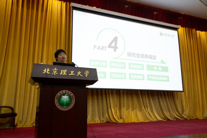 陈禾对新生们进行了研究生培养过程教育,她从学院研究生人才培养的目标与定位出发,详细讲解了研究生教务运行、质量监控、学籍管理、毕业要求、奖助体系、国际化交流等方面的内容。她嘱咐全体新生,要明确自己的发展方向和研究领域,熟悉研究生培养过程,选择适合自己的培养方案,培养国际化视野,学院会做好各项服务工作,与全体新生一起砥砺前行。