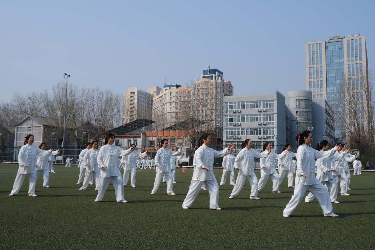 比赛当天,体育场上气氛热烈,来自各个学院的参赛队伍齐聚一堂,以饱满的热情和昂扬的斗志迎接这场体育文化盛宴。信息与电子学院的教师们身着整齐的服装,精神抖擞地走上赛场。从起势到收势,他们动作行云流水、刚柔并济,每一个招式都精准到位,充分展现了太极拳的独特魅力,也彰显出平时训练的扎实功底。整齐划一的动作、沉稳自信的神态,赢得了现场评委们的高度认可。