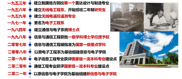 北京理工大学信息与电子学院前身是始建于1953年的第一个中国地方院校雷达设计与制造专业,是我国首批从事雷达、遥控遥测领域科研与专业人才培养的单位之一。1956年,以雷达设计与制造专业为基础建立无线电工程系(五系)。1971年,无线电工程系更名为电子工程系。2002年,电子工程系参与组建信息科学技术学院。2008年,以原电子工程系为基础重组为信息与电子学院。在不同历史时期均是国家历批次重点建设的专业学院。经过近七十年的发展,学院已成为我国电子信息领域高层次人才培养、科学探索和高新技术研发的重要基地。
