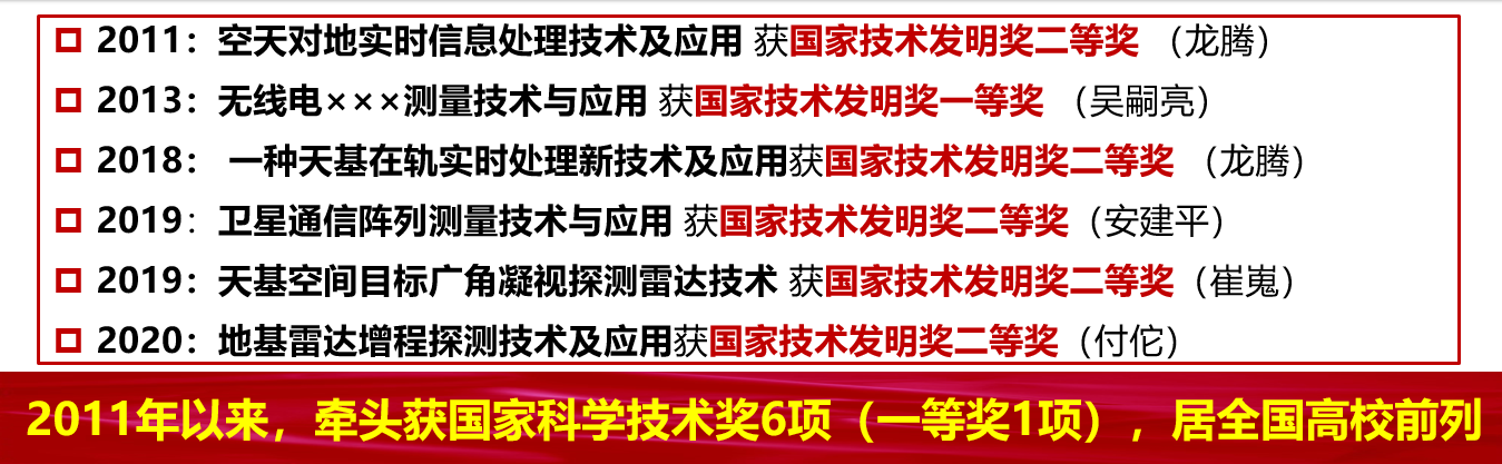学院以服务国家战略急需为使命,坚持目标导向和问题导向,主动谋划和策划,科技创新能力持续提升。2011年以来,在空间目标雷达探测、在轨智能实时处理、卫星通信阵列测量等方面取得重大标志性成果。先后研制出神舟八/九/十/十一/十二/十三/十四/十五、天舟一/二号交会对接微波雷达信号处理机,天宫一/二号、天和核心舱微波应答机信号处理机,圆满用于载人航天工程历次空间交会对接;研制出嫦娥五号轨道器微波雷达信号处理机,圆满用于人类首次月球轨道交会对接;研制了我国北斗二代/三代卫星导航接收机、首个光学卫星星上处理系统、首个微波成像卫星星上处理系统、我国首套卫星通信阵列并行测量仪等多个第一;牵头获得国家技术发明二等奖6项(含一等奖1项),在全国高校学院中名列前茅;参与获得国防技术发明特等奖1项、国家科技进步一等奖1项,学术与行业影响力持续提升。